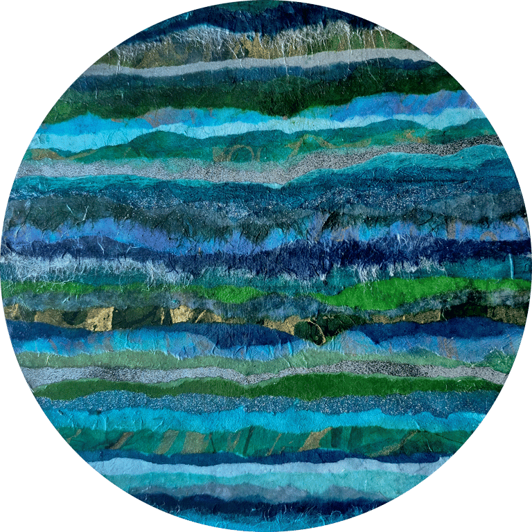 Circular compositions dominated by horizontal bands of color that vary in width and exhibit subtle shifts in hue and intensity, creating a sense of movement and visual interest. The layered textural effect of these bands is reminiscent of geological strata, layers of soil and rock, varying depths and movements of the ocean, or even the rings of a distant planet.